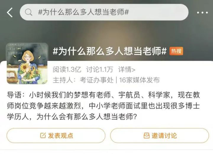 这个热门话题有上亿人阅读、上万人参与讨论。据今年教育部公布的最新数据:“全国教师规模不断扩大,根据最新统计数据显示,教师总数已经达到1792.97万人,比上年增加60.94万人,增长3.52%”。