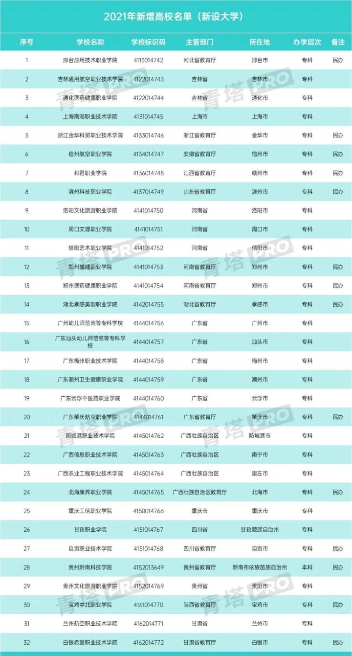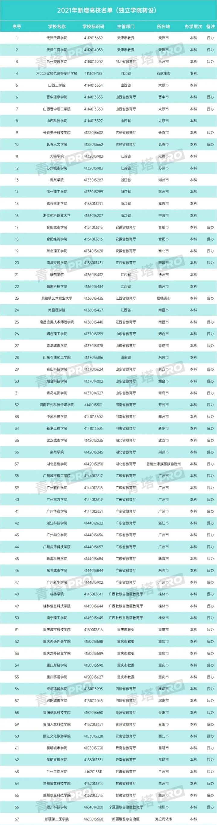 据统计,最新公布的2756所普通高等学校高校名单中,出现了113所“新大学”,其中本科层次的高校为78所,专科层次高校为35所。它们之中,有81所是由独立学院合并、转设或学校更名而来,其中包括10所由多所高校合并转设或更名的“新大学”,由独立学院转设而来的高校有67所。