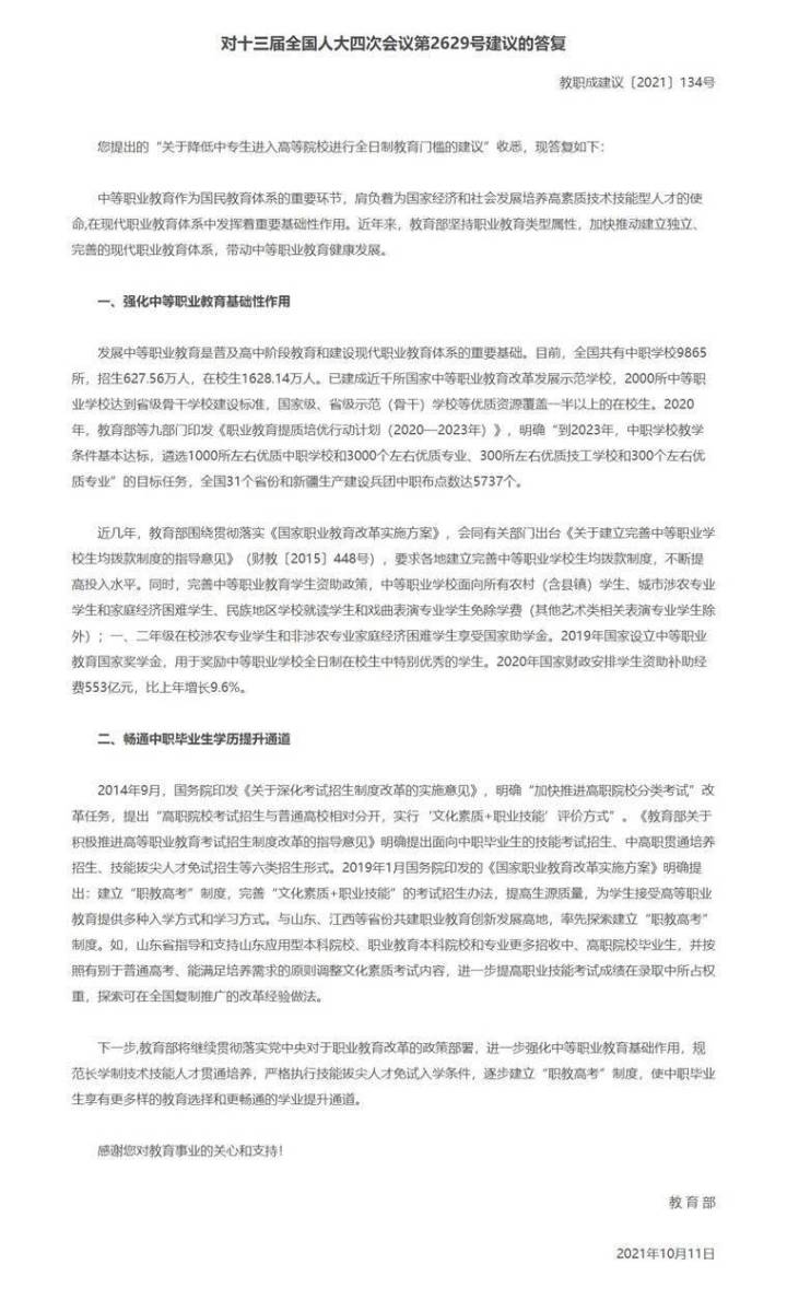 在全国人大四次会议上,有代表提议“降低中专生进入高等院校进行全日制教育门槛”。近日,教育部在官方公布了对此建议的答复。