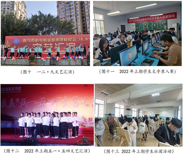 (3)学校积极搭建活动平台,让学生在活动中得到锻炼,在活动中受到潜移默化的教育。2023年上期举行了第四届“九九通讯杯”男女子篮球赛,下期组织了男女子篮球队参加了2023年全市中职组男、女校园篮球比赛,男女队都获得了较好的好成绩。2023年上期举办了庆祝五一和纪念五四文艺汇演,下期举办了纪念“12.9”运动87周年的文艺汇演。